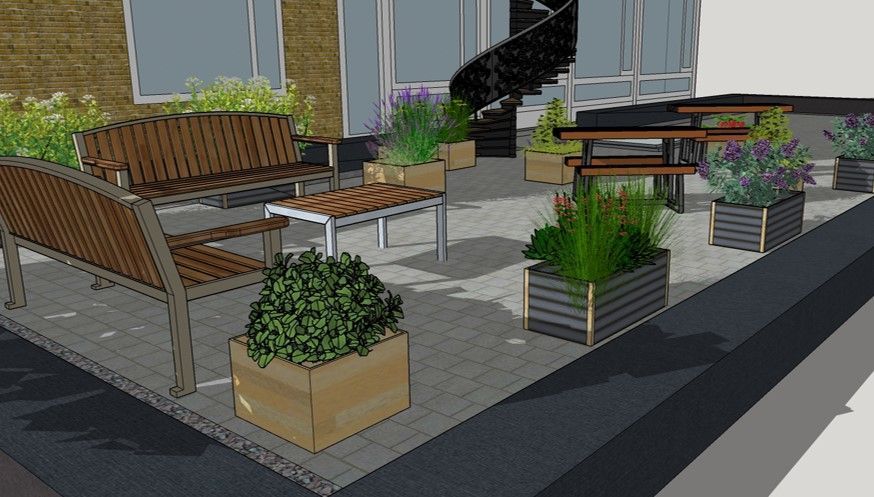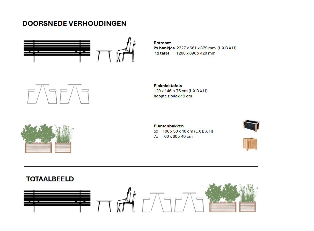 Op basis van het inrichtingsplan is de dakbelasting berekend. Het terras is ingericht in een retrosfeer met nieuwe banken, salontafel en picknicktafels (Grijsen Park- & Straatdesign). Naast hergebruik van oude plantenbakken zijn door leerlingen nieuwe plantenbakken van duurzaam hout gemaakt.