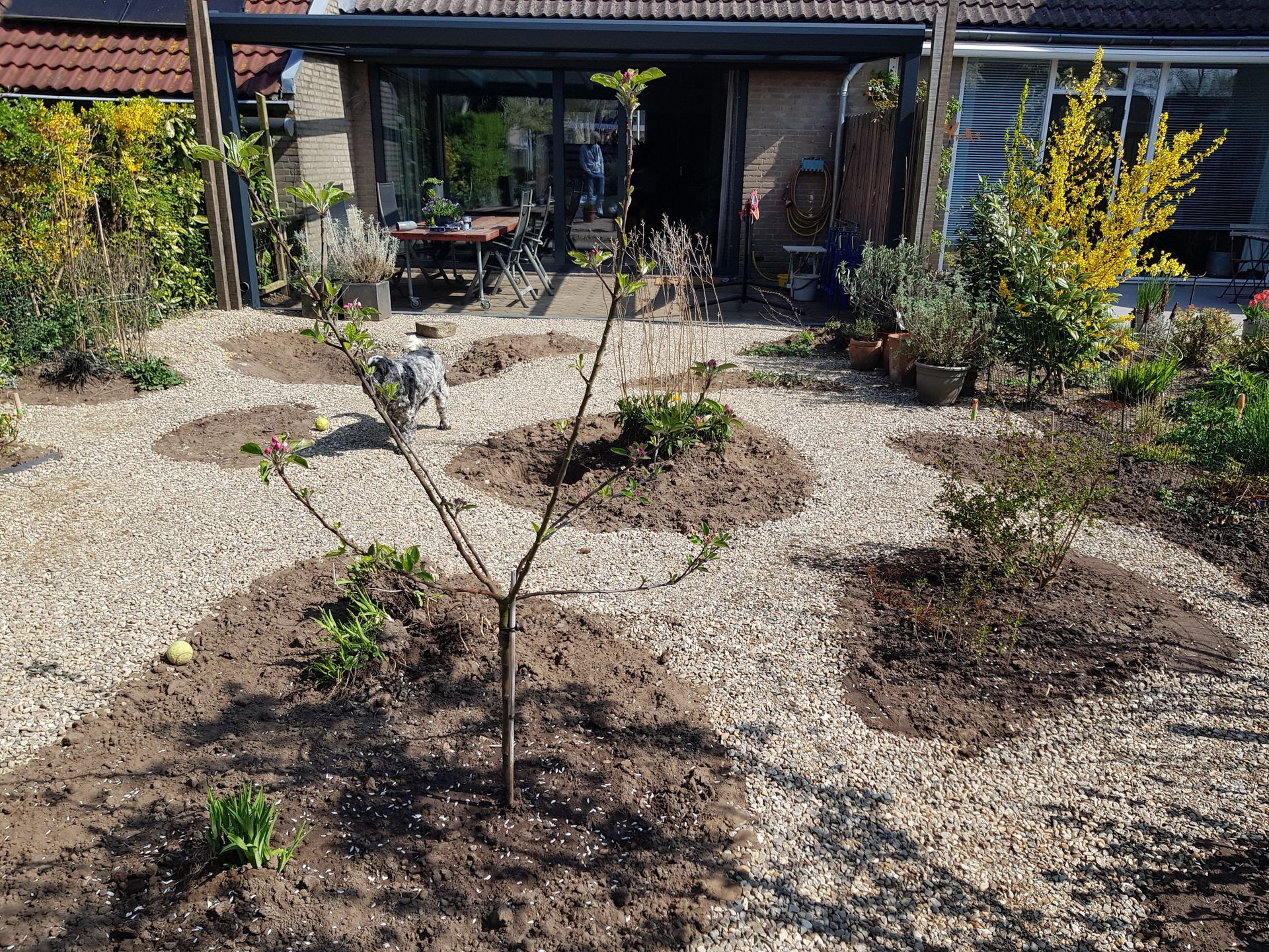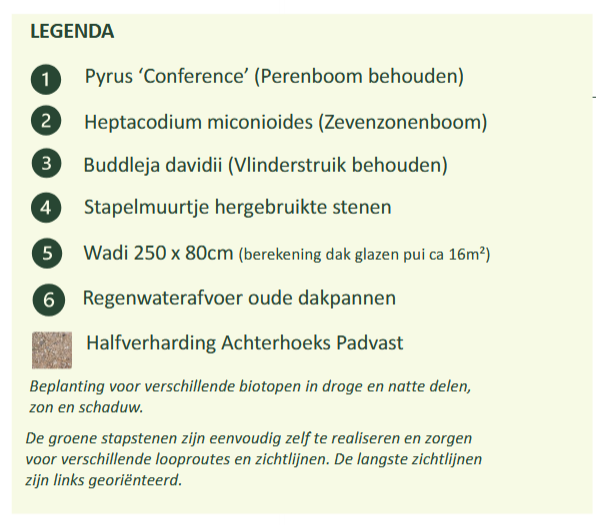 - gazon vervangen door beplanting met behoud van de fruitbomen