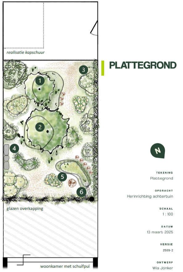 Het organisch tuinontwerp is geïnspireerd op de groene wijk en past bij de wensen van het gezin. De boonvormen met de wadi in de hoofdrol zijn de groene stapstenen door de tuin. De bestaande beplanting is aangevuld met veel inheemse soorten, zoals: Persicaria bistorta 'Hohe tatra', Ajuga reptans, Lysimachia nummeralia 'Aurea', Fragaria vesca, Geum rivale, Verbascum nigrum en grassen als Briza media en Molinia caerulea 'Moorhexe'.