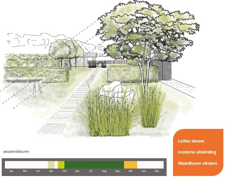 Het strakke ontwerp past bij de karakteristieke sfeer uit de jaren'30: symmetrie met een duidelijk middelpunt die de strakke (zicht)lijnen versterken in samenhang met de passie van het gezin voor Italië en het mediterrane buitenleven. In de basis natuurlijke grijsgroene en aardse kleuren. Diverse bomen creëren de gewenste schaduw bij de sfeervolle zitjes; twee dakbomen Morus alba 'Fruitless', de meerstammige witte Himalayaberk Betula utilis Jacquesmontii en de Zilveresdoorn Acer saccharinum. De beplanting en voorjaarsbollen in de grassenborders passen in de natuurlijke overgang naar het weiland en de landelijke omgeving.