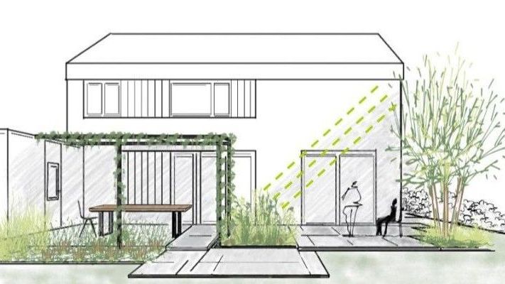 De inventarisatie en analyse van de huidige situatie was een belangrijk onderdeel voor een passend ontwerp. Voor meer hoogte en transparante schaduw zijn op diverse plekken meerstammige bomen toegevoegd. De zandbak is getransformeerd als pluktuin en fungeert daarnaast als kolomdrager voor de pergola. In de voortuin is meer structuur in de borders toegevoegd met o.a. uitbreiding van de ligusterhagen en aanvullende inheemse- en wintergroene planten.
