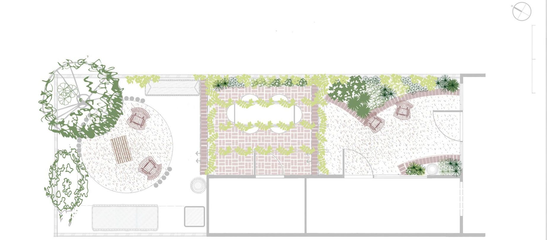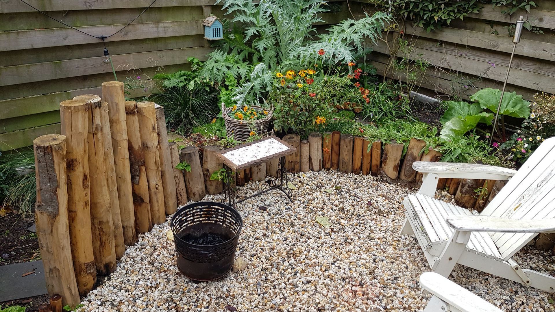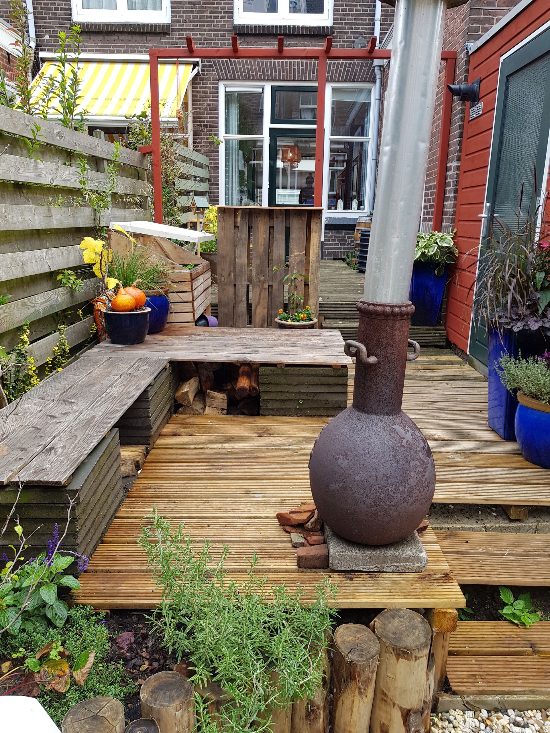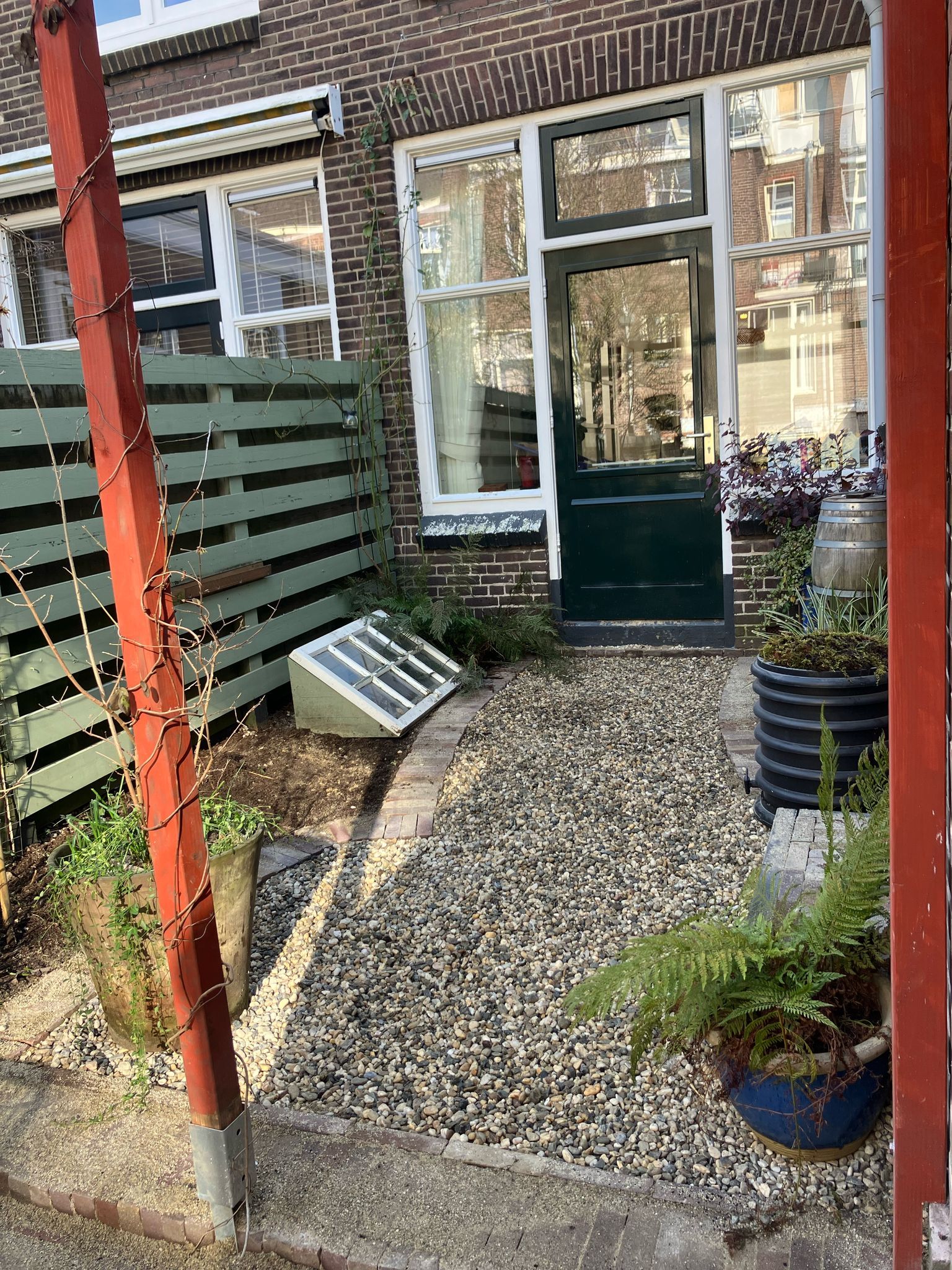 Een stadstuin ontwerpen die natuurlijk oogt en waar veel vogels, vlinders en bijen op afkomen … een mooie uitdaging voor de volledig betegelde tuin. Het concept voor het ontwerp ‘Pura Vida’ betekent puur leven en sluit aan op de weelderige beplanting en het pure leven in Costa Rica waar de bewoners hebben rondgereisd. De smalle lange schaduwrijke tuin oogt breder door de halve en hele cirkels van grind, verbonden met houten vlonders. De hoogteverschillen zijn behouden en ingezet voor verschillende zitjes, waarvoor de tegels zijn hergebruikt. Ook een aantal (klim)planten zijn behouden en aangevuld met planten voor halfschaduw. Een half jaar na aanleg oogt de tuin al weelderig en trekt volop dierenleven.